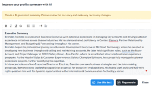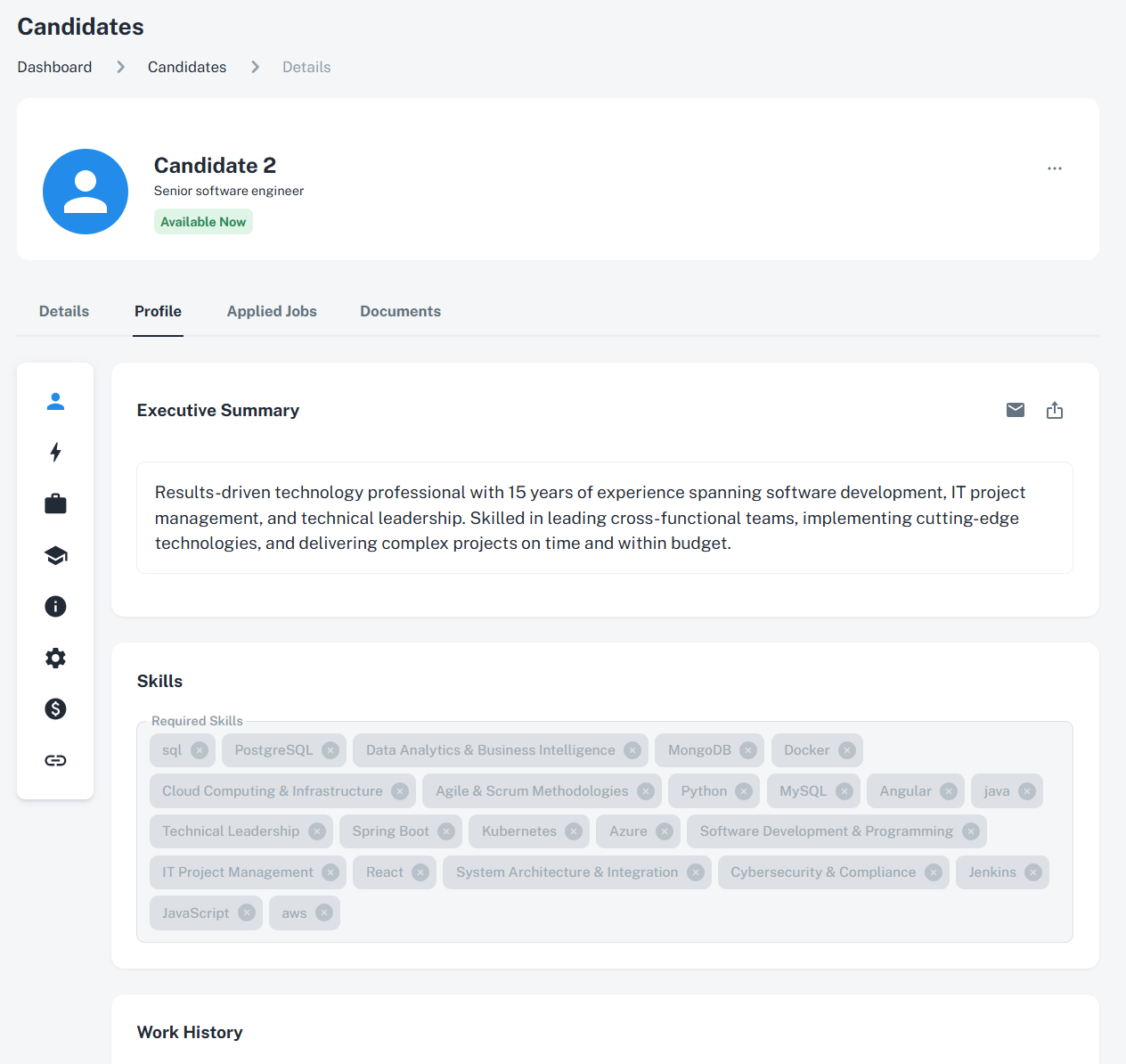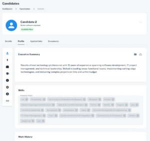 Before you send a candidate to a client, align their profile to the job description with one click. Our AI highlights relevant experience and tailors the content – giving your candidate the best shot.