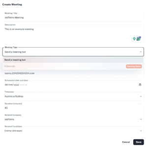 Never take notes during a meeting again. Our AI Video Bot joins your meetings, records the conversation, and leaves a clean summary in the candidate or client profile.