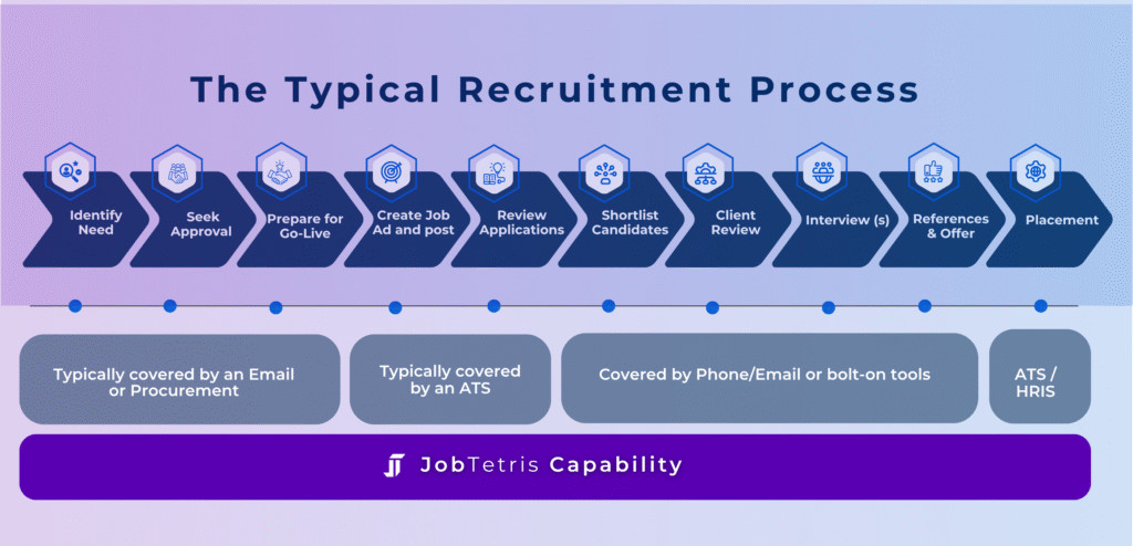 JobTetris brings every role, recruiter, and candidate into one connected system. See what’s happening across your hiring activity in real time and keep everything organised from request to placement.