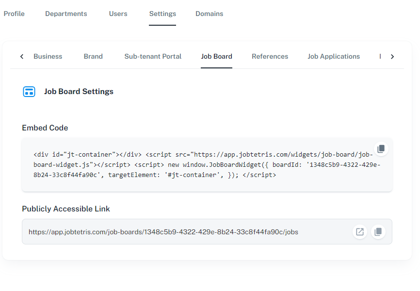 Make it simple for candidates to find and apply for your roles. With JobTetris, you can embed your branded job board directly into your company website, with no coding and no hassle.