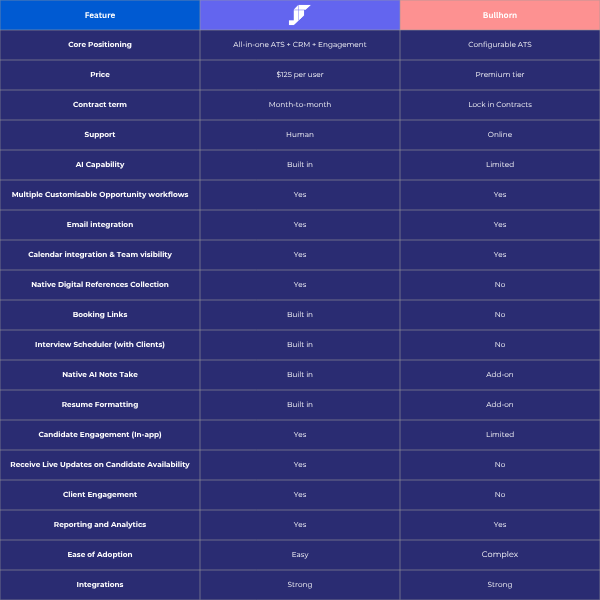 JobTetris is a modern, all-in-one ATS, CRM and engagement platform designed for recruitment agencies that want speed, visibility and simplicity. Bullhorn is an established enterprise recruitment system build on complexity, often requiring significant configuration, integrations and ongoing dedicated management.