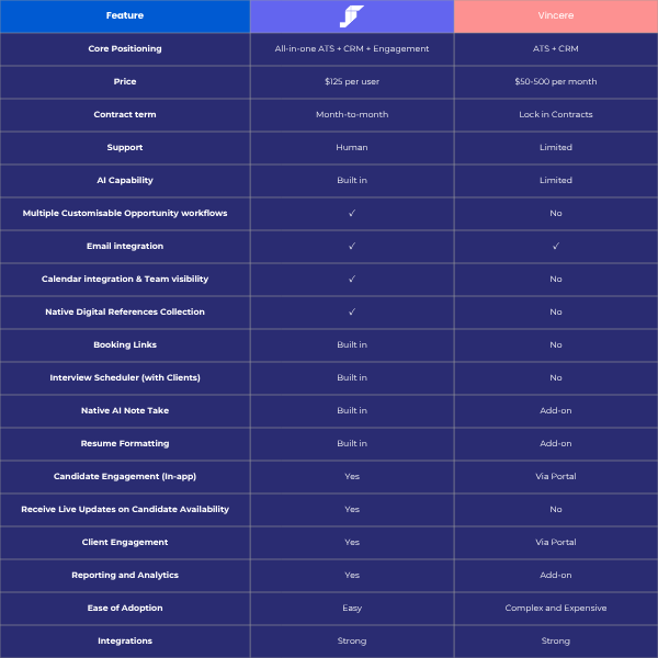 JobTetris is a modern, all-in-one ATS, CRM and engagement platform built for scaling recruitment agencies. Vincere operates more like a legacy ATS and CRM system with a layered mismatch of integrated tools that delivers poor functionality, limited configurability, and complex workflows.