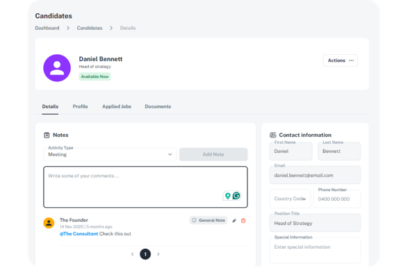 When sales and business development activity sits in a separate CRM from the recruitment workflow, consultants lose visibility across the full hiring pipeline. An effective Applicant Tracking System brings client relationships, job management, and candidate tracking together in one place.